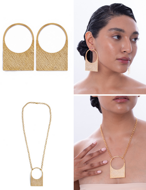 Highlight your look with the Contour Necklace and Earrings from the Hatke collection. Inspired by geometric shapes, this necklace is unique, has an edgy look, and is rare. Handmade to perfection, this statement piece highlights your collarbone and takes your outfit to the next level with its modern design