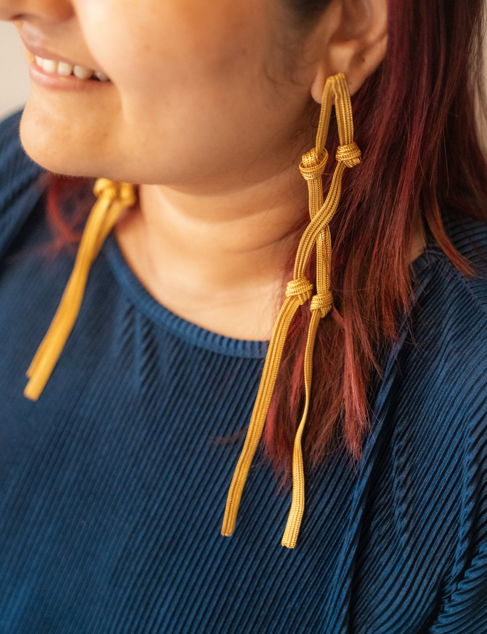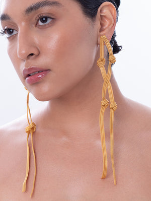 Stand out from the crowd with these Double-Knotted Golden Mesh Long Earrings from the Meher collection. Inspired by the textured 1970s vintage monet pieces, these earrings can add a touch of glamour to your ensemble. Intricate, modern yet graceful, these beauties will stand out from every accessory you own.