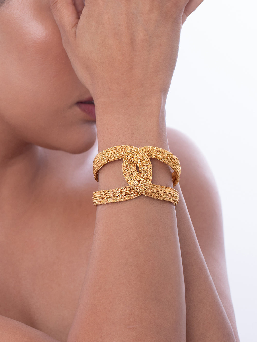 Elevate your style effortlessly with this Golden Braided Mesh Bracelet from the Meher collection. Perfect for every ensemble and event, this wrist-hugging bracelet gets its inspiration from the 1970s vintage monet pieces. Radiant, intricate, yet graceful, this accessory is a statement piece that commands attention in every room you walk.