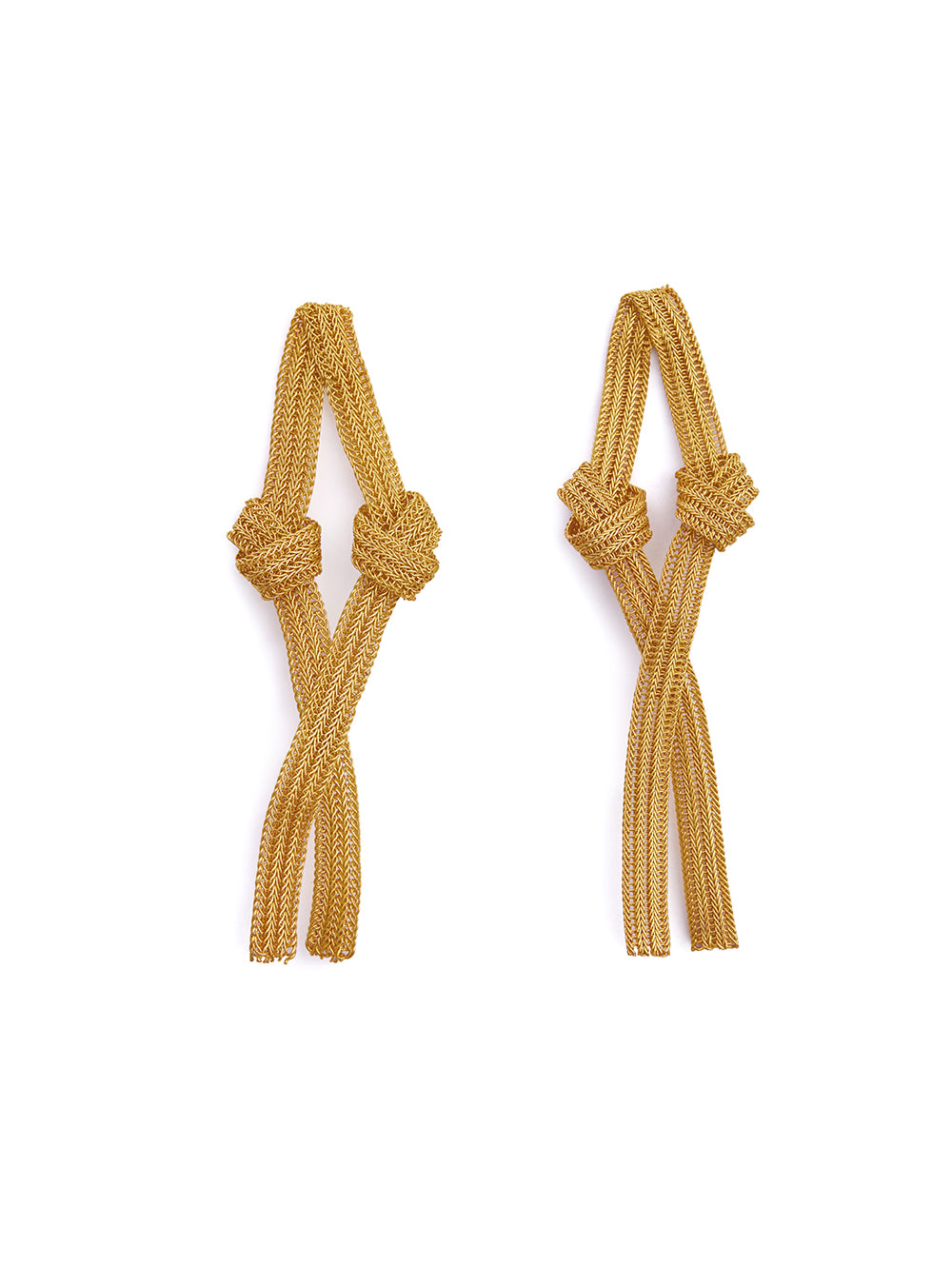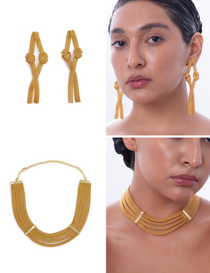 Radiate in these Double-Knotted Golden Mesh Short Earrings and Necklaces from the Meher collection. Inspired by the beautiful 1970s monet pieces, these earrings can elevate any look with effortless grace. Chic yet intricate, these beauties will ensure you make a statement in every room you walk and steal the spotlight instantly.