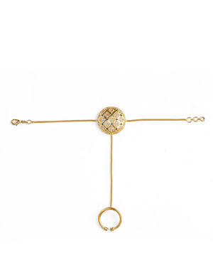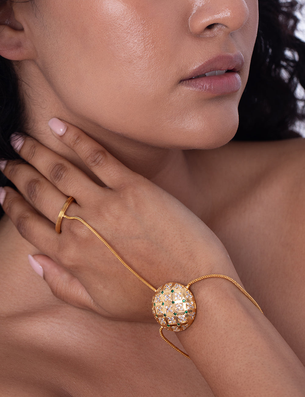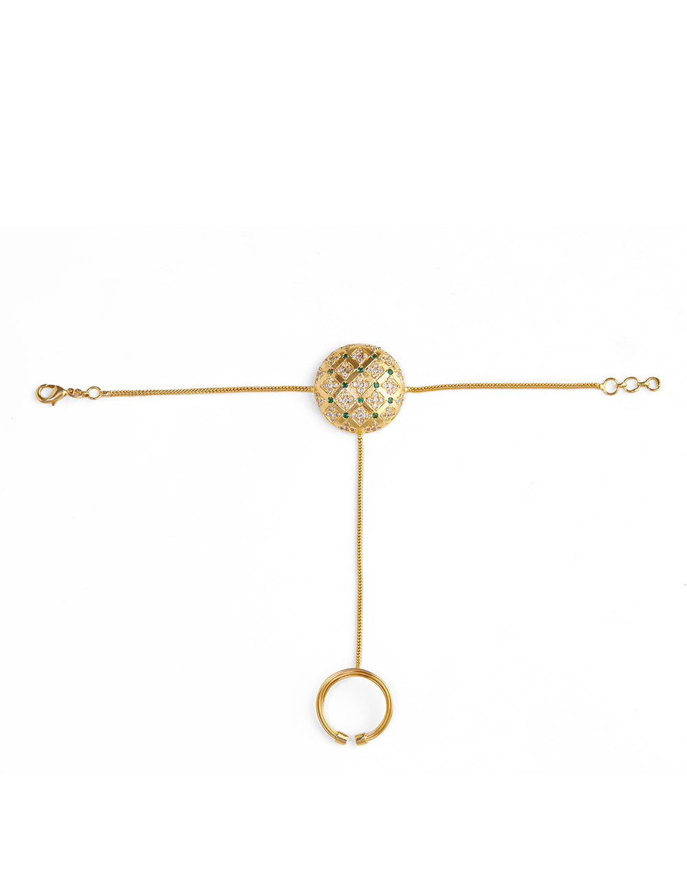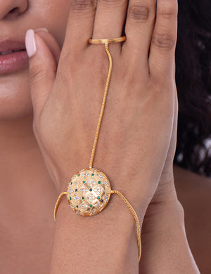 Glam up with the Mastani Emerald Haathphool from the Mastani collection. Intricately designed to adorn your wrists, this hand ornament creates an interplay of emerald stones set against a golden finish. Perfect for grand weddings or your everyday look, this captivating piece celebrates tradition with modern aesthetics.