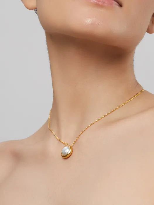 Peacemaker Neckchain Not so tiny mother of pearl nestled in the centre of a delicate gold chain & earrings. This can be your go to accessory.