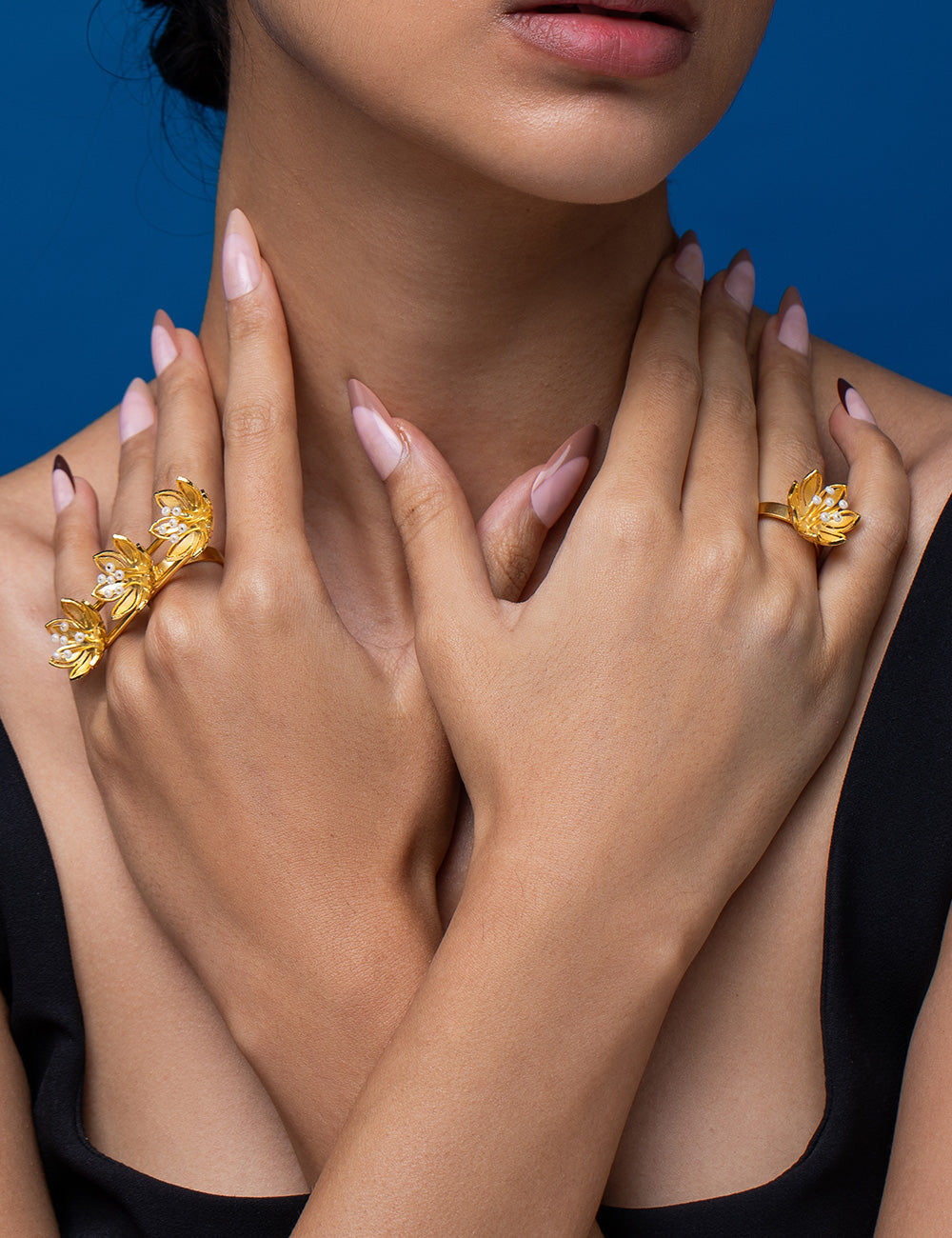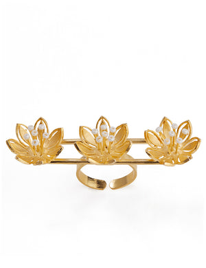 Draw attention to your hand with the Pearly Golden Flower Three-Finger Ring from the Saanjh collection. With a moonlit radiance, its design features three golden flowers with pearls that are lined horizontally, capturing flowers in bloom. Lightweight, built to last, yet comfortable, it adds a touch of sophistication to all your outfits.
