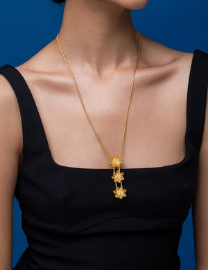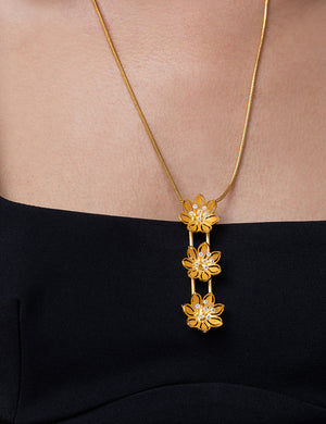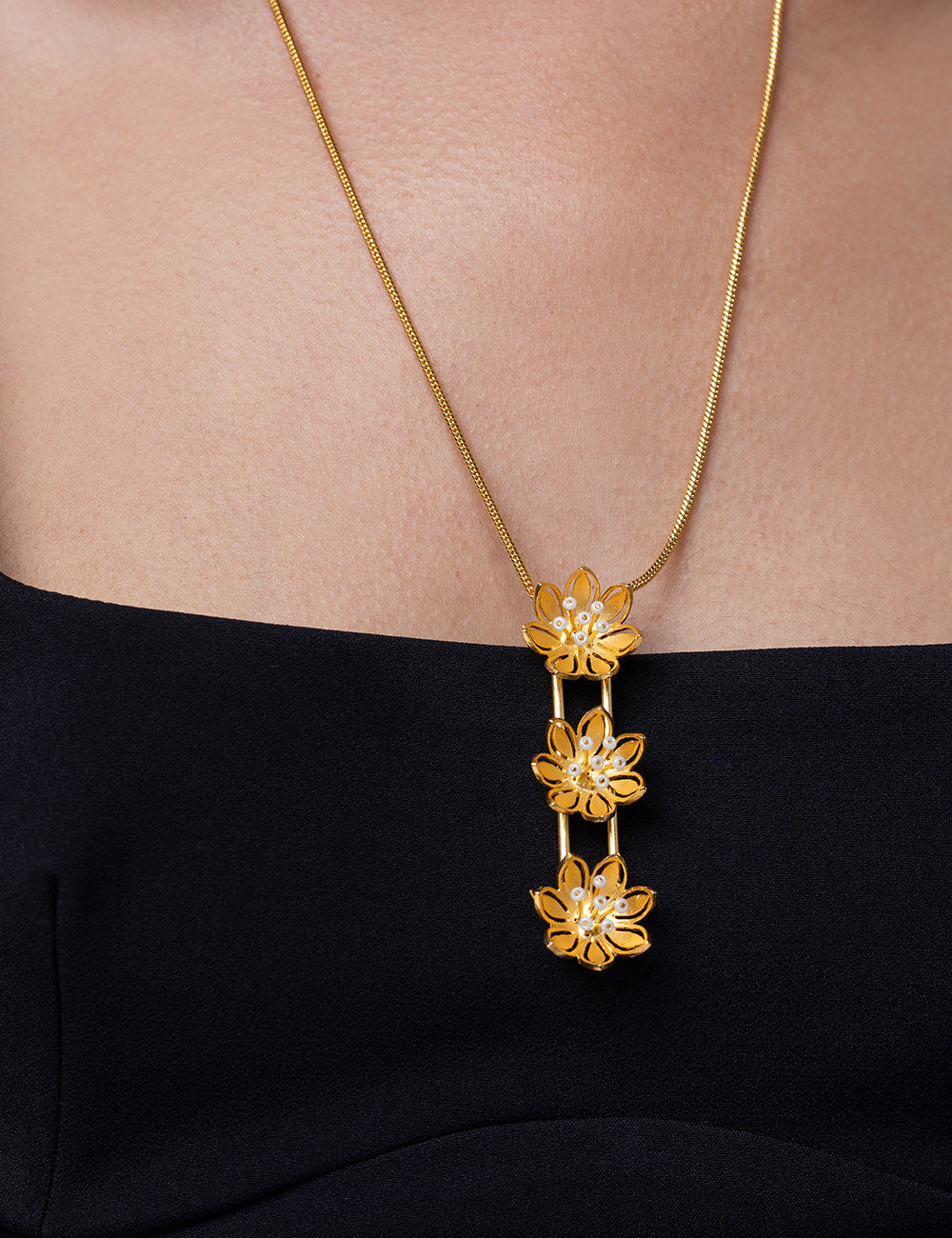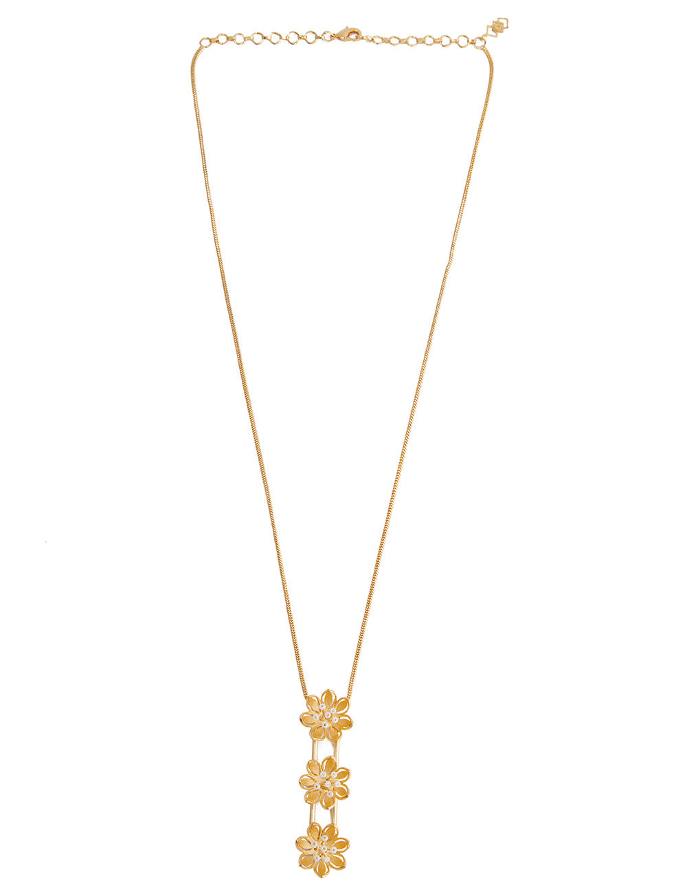 Bring nature's essence to your look with the Pearly Golden Flower Pendant Necklace from the Saanjh collection. With a design that resembles flowers in full bloom, it features three golden flowers with pearls lined vertically, having a serene, moonlight-like glow. Comfortable, durable yet lustrous, it enhances your neckline and complements your outfits.
