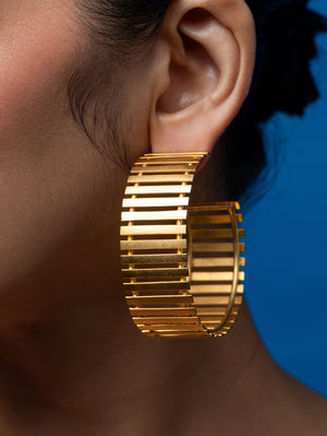 Make a statement with the Gold Striped Fence Hoops from the Sunehri collection. Meticulously crafted for you and capturing the shade of the golden hour hue, they have a striking appeal that elevates your ensemble effortlessly. Lightweight, bold yet dainty, they are perfect for every look from daytime brunch to a date night.